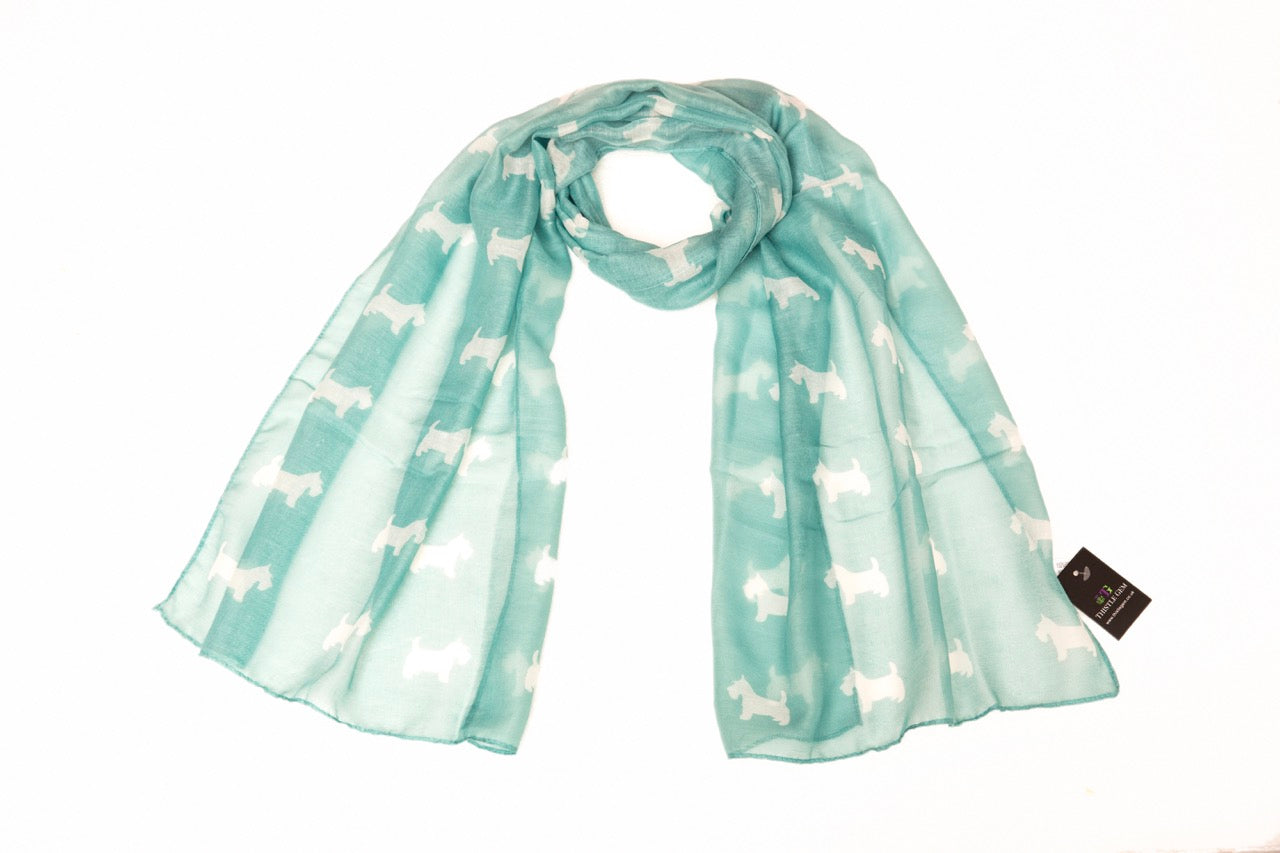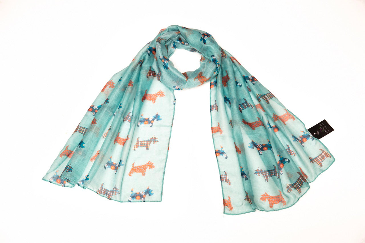 This lightweight Scotty Dog scarf is a perfect addition to any wardrobe. Crafted from a lightweight material, this scarf is comfortable and adds a touch of style to any look. The bright pattern is eye-catching and sure to be a conversation starter.